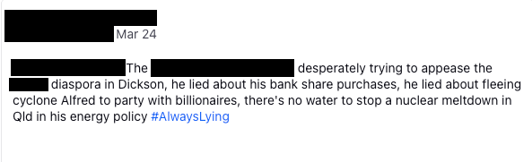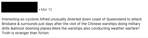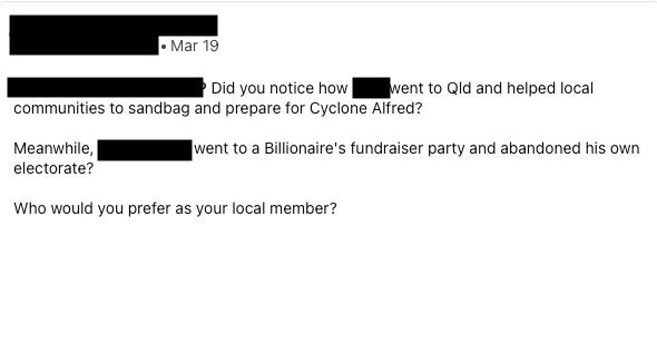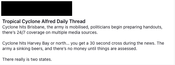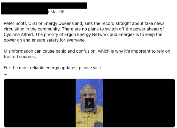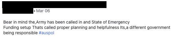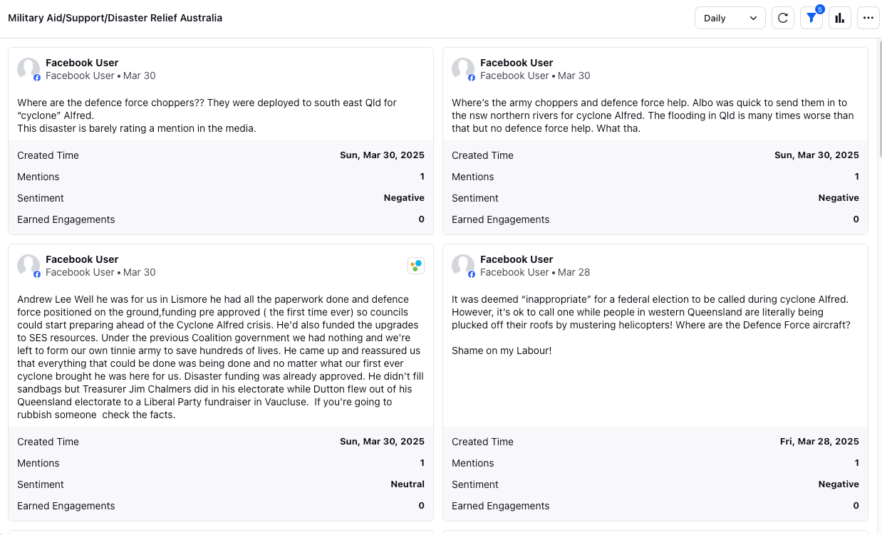 The organisation worked closely with the Australian Defence Force throughout the disaster to support planning and response efforts for Cyclone Alfred. While more than 1,500 ADF personnel were committed to the response, monitoring frameworks identified significant discourse suggesting a perceived lack of ADF involvement in the crisis. Approximately 191 messages referenced this narrative across the monitoring period, including claims of political motivations resulting in a lack of ADF presence and perceived preferential treatment for certain regions.