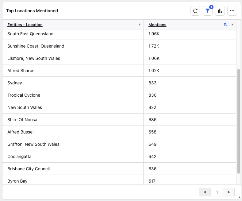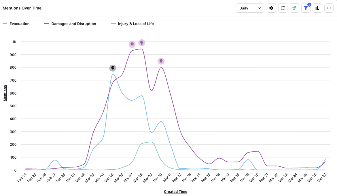 Conversation volume by mentioned locations. These insights provided an overview of discourse volume among impacted locations and severity, allowing the agency to respond accordingly.